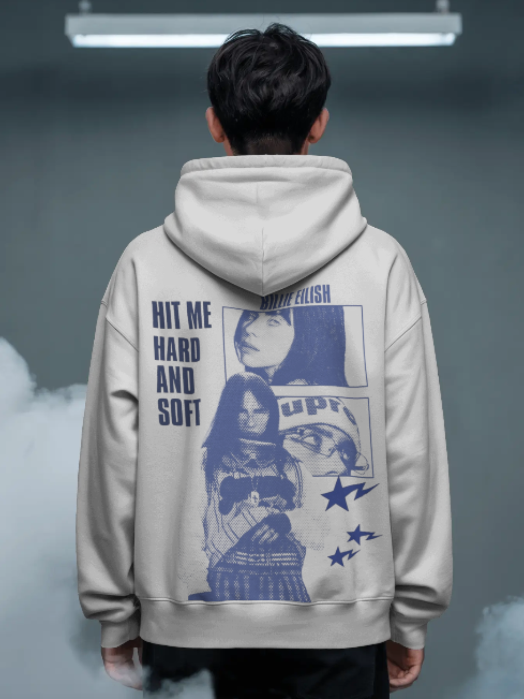 THE EILISH ECHO pulls inspiration from Billie’s raw emotion and calm chaos. The front reads “TALKING TO THE MOON” in a soft, distressed print — calm, lonely, and real. The back hits deeper with “HIT ME HARD AND SOFT” visuals, paying homage to the mood and depth that define her sound.